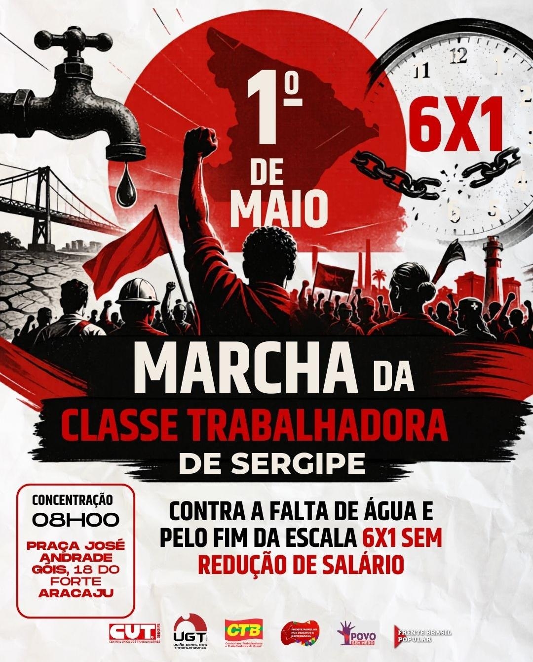 Neste 1º de maio, estaremos nas ruas contra a falta de água em Sergipe, pelo fim da escala 6x1, pelo combate ao feminicídio e a todas as formas de violência contra as mulheres, pelo enfrentamento à pejotização, pelo fortalecimento das negociações coletivas e pela regulamentação do trabalho por aplicativos.