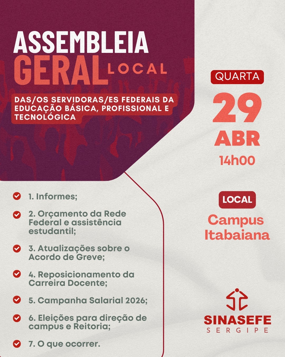 O Sinasefe Sergipe convoca suas filiadas e seus filiados para participarem da Assembleia Geral Local, que será realizada na quarta-feira, 29 de abril, às 14h, no Campus Itabaiana do Instituto Federal de Sergipe (IFS).