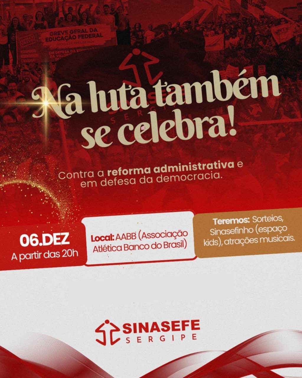 Com o tema ”Na luta também se celebra! Contra a Reforma Administrativa e em defesa da democracia”, nossa confraternização promete uma noite de união, alegria e integração.