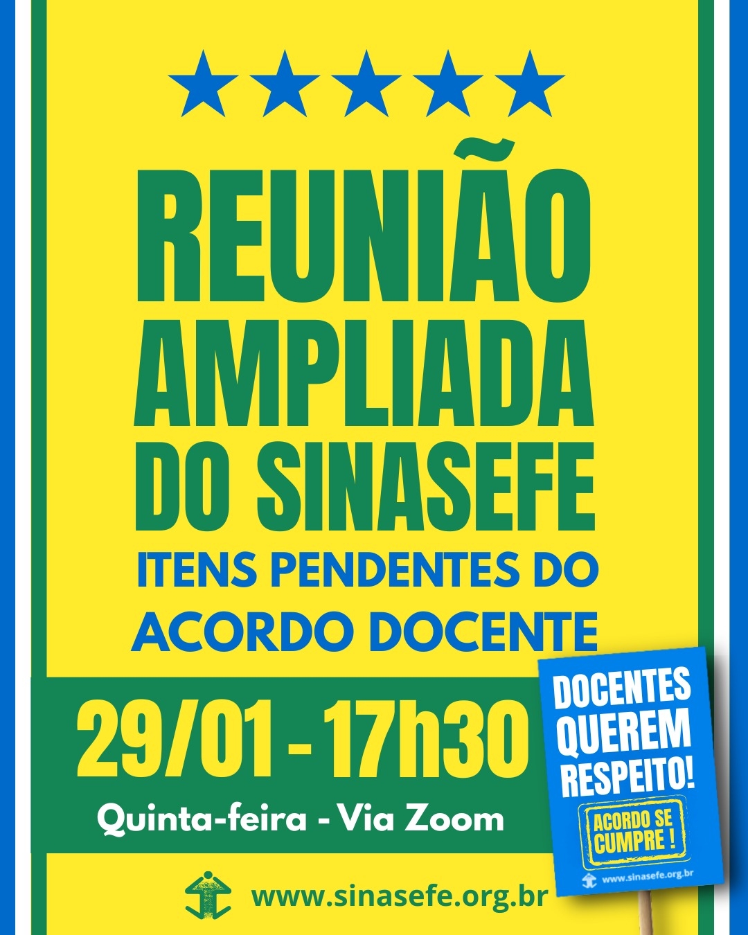 AMANHÃ (29/01), às 17h30 horas, realizaremos uma Reunião ampliada sobre as pendências do acordo docente.