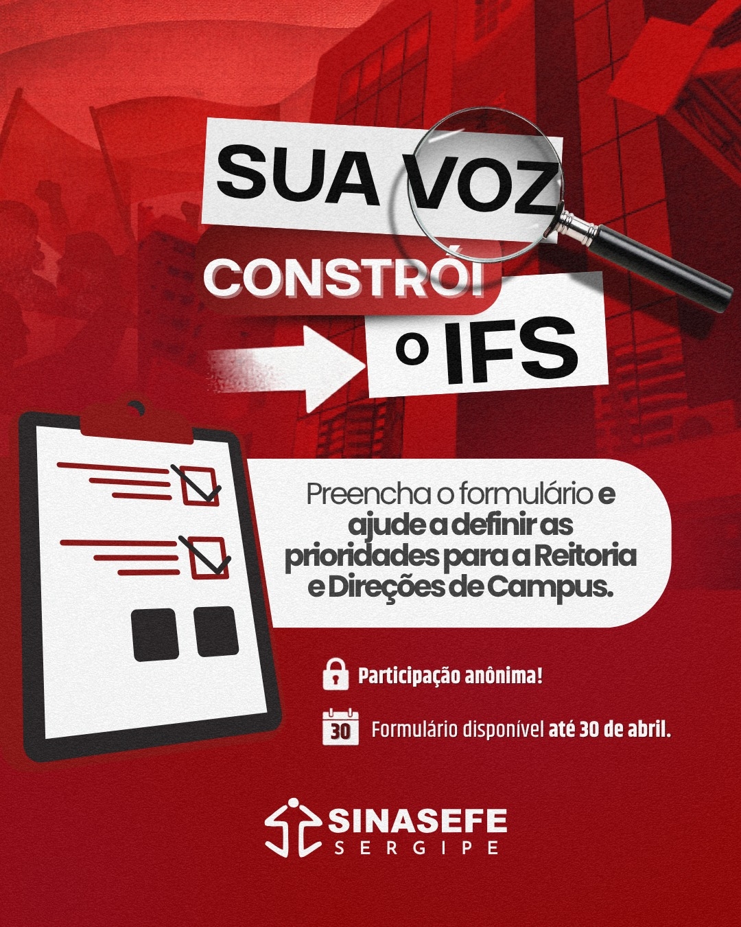 O Sinasefe Sergipe lança uma campanha para mapear, entre as servidoras e os servidores, o que se espera das candidaturas à Reitoria do Instituto Federal de Sergipe e às direções de campus, diante da proximidade do pleito.